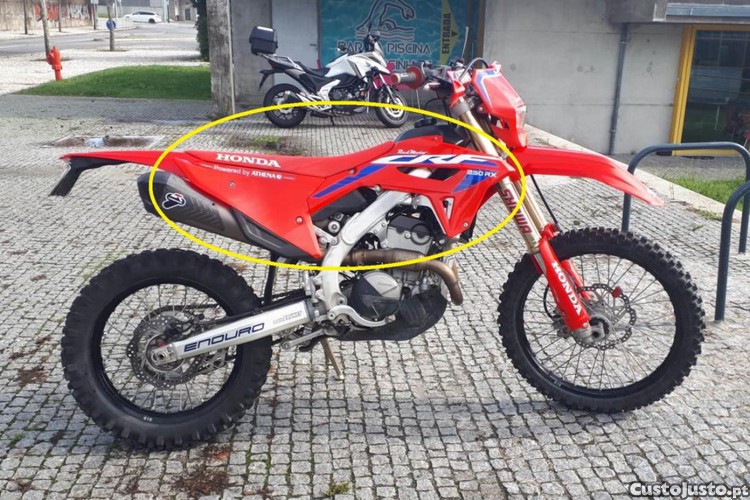 Vendo par de tampas laterais de radiador (frente) e de filtro de ar (trás), com kit gráfico. Serve no modelo de 2022 a 2024 da CRF 250 R e RX Redmoto. O preço é para o conjunto das 4 tampas. Têm pouco uso. Estão em bom estado.