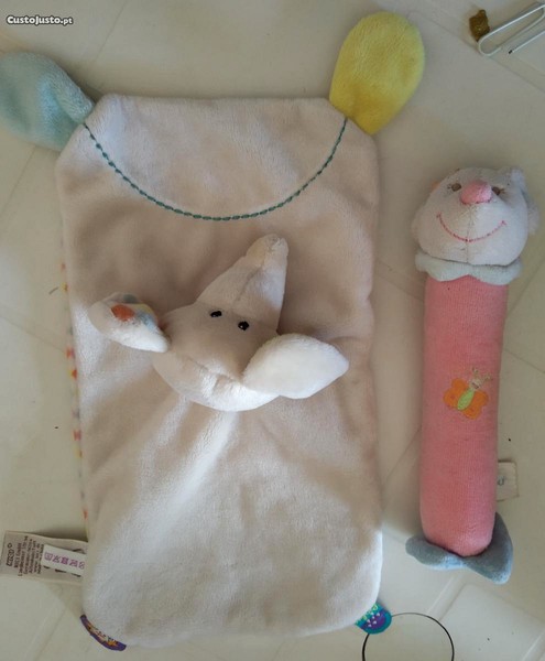 Mantinha pequena tipo fralda com brinquedo cabeça de elefante.