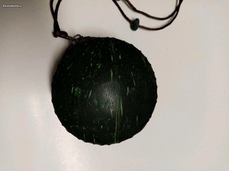 Porta moedas dos anos setenta em tom verde escuro e fita para usar no ombro ou ao pescoço.