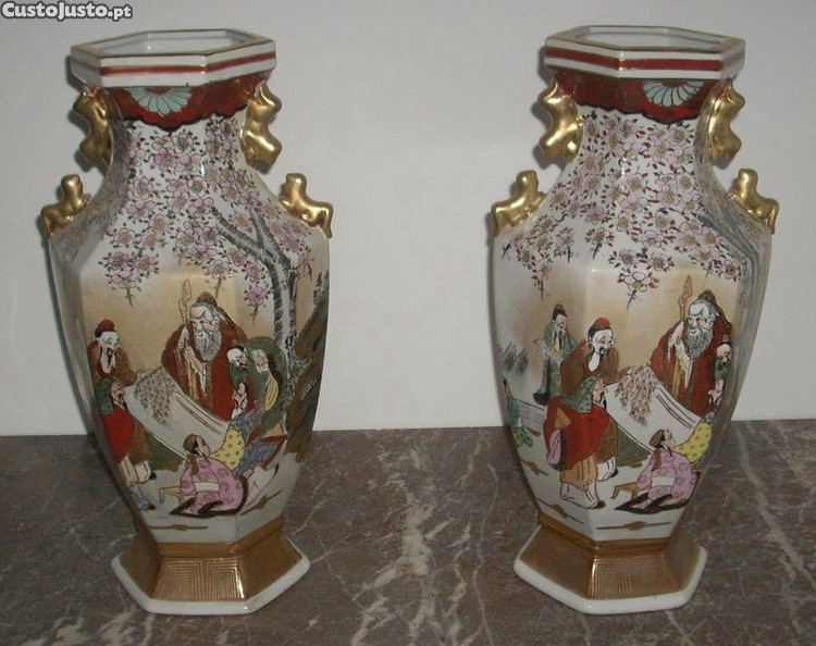 Par de jarras sextavadas em porcelana chinesa, com decoração vegetalista, representando encontro social. Asas em forma de animal. Lacadas e filetadas a ouro.