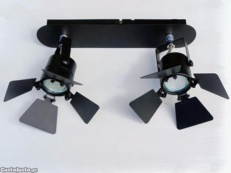 Candeeiro de teto estilo projetor, duplo, com luzes led, cor preto fosco. Artigo usado como novo com escassas marcas de uso, em excelente estado geral, totalmente funcional.