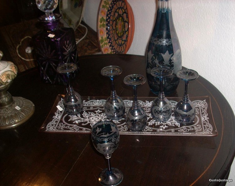 Conjunto de Licoreira c/ cálices, cor azul petróleo, decoração floral.