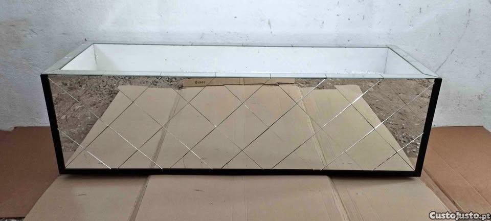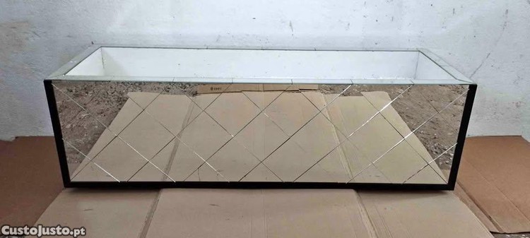 Caixa floreira usada em excelente estado geral, fabricada em madeira de aglomerado, forrada com espelhas e dotada de rodas multidirecionais.