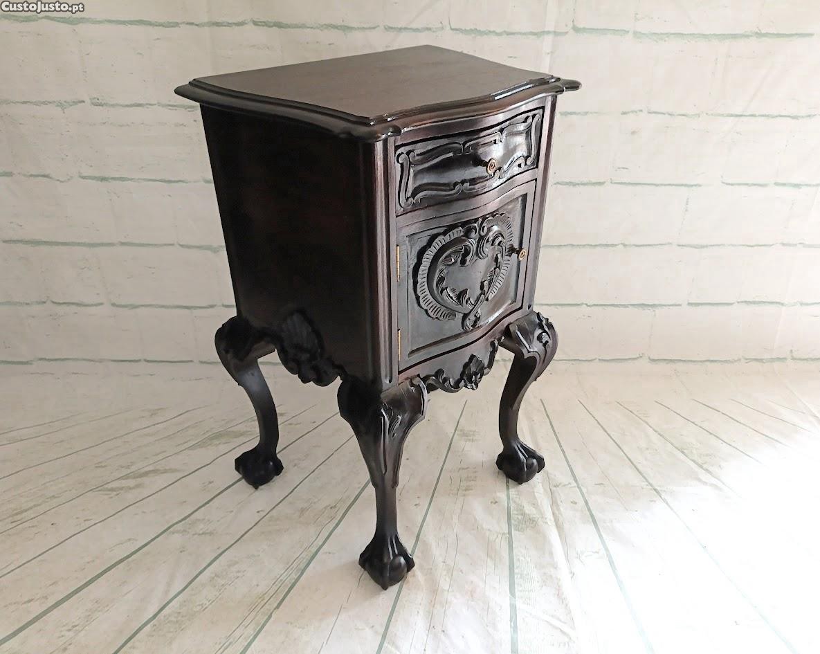 Peça de mobiliário em madeira entalhada, com elementos vegetalistas relevados, gaveta e porta com puxadores em metal amarelo e pés em forma de garra e bola, da segunda metade do século XX. Em excelente condição.