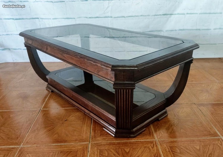 Grande mesa de centro em madeira maciça (suponho ser castanho), usada em ótimas condições gerais com escassas marcas de uso, dotada de 2 tampos em vidro, com pernas em forma de arco.