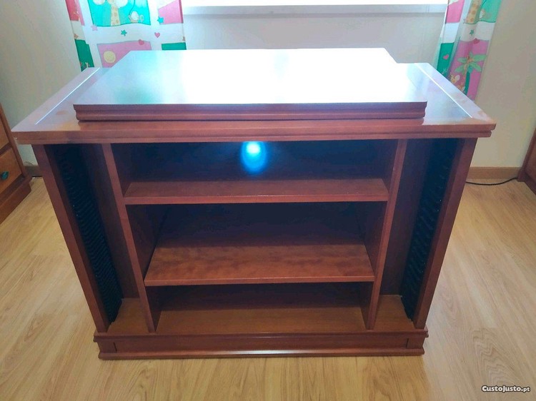 Móvel para TV com tampo rotativo em cerejeira e com rodas ocultas, em muito bom estado