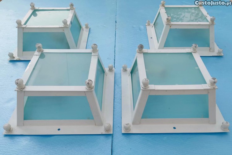 Tratam-se de 4 candeeiros/plafoniers de teto, usados em bom estado geral (a precisar alguns retoques de pintura). Armação em metal completada com 5 painéis em vidro, sendo um inferior e quatro laterais (oferta de 1 vidro lateral suplente). Possuem casquilhos em cerâmica.