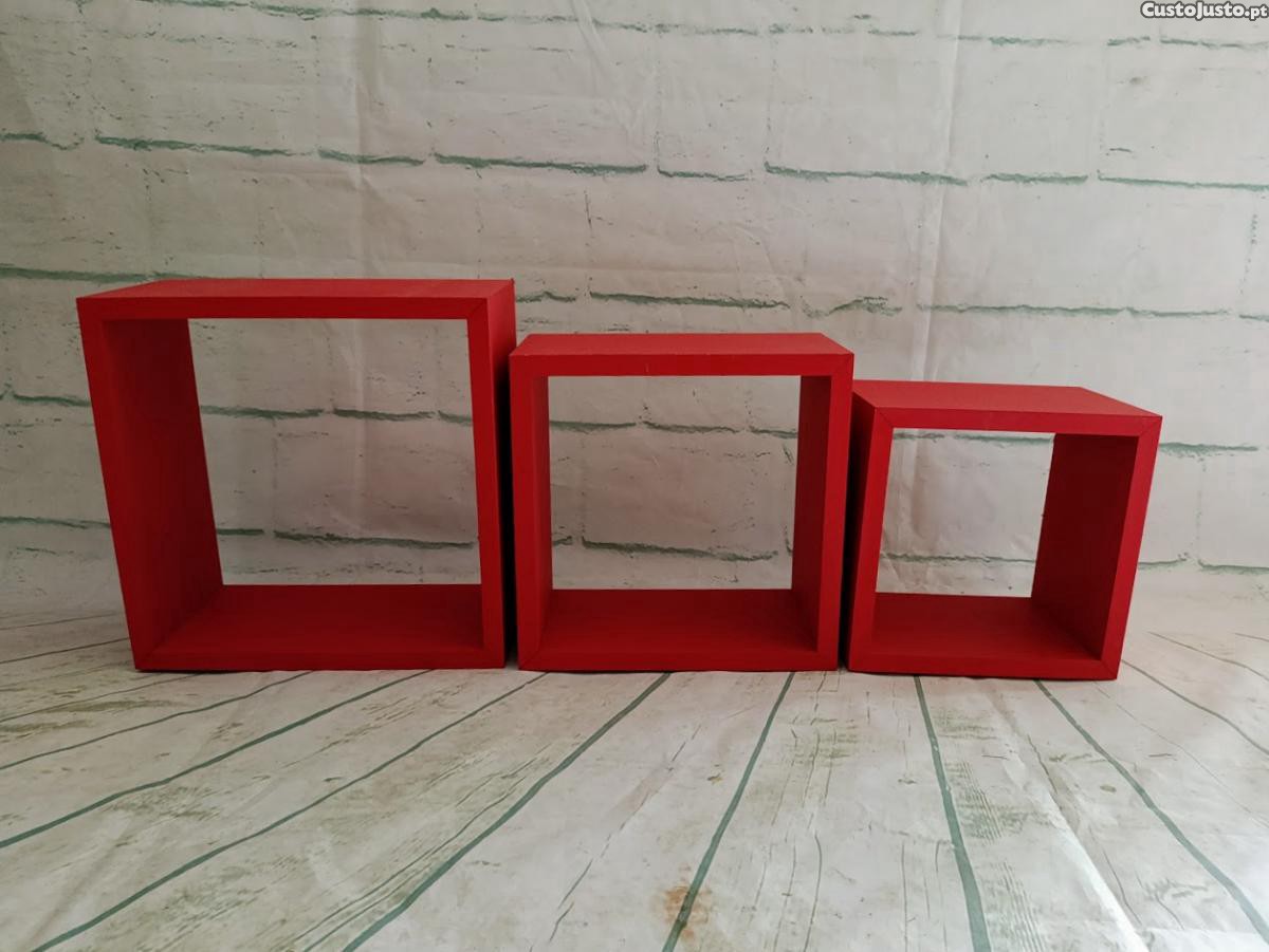 Preço: 15 €Trio de prateleiras madeira em forma de cubo vermelho mate