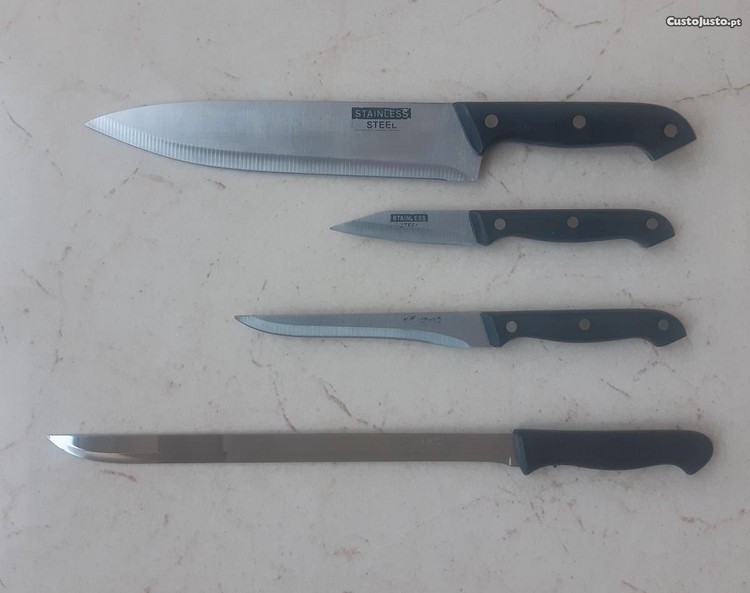 Conjunto de 4 facas em aço inoxidável, como novas (apenas a média foi utlizada mais vezes), a precisarem de ser afiadas.