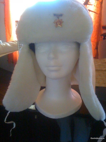Boné em pelo branco, original da Rússia, como pode ver pela etiqueta e pelo emblema frontal.