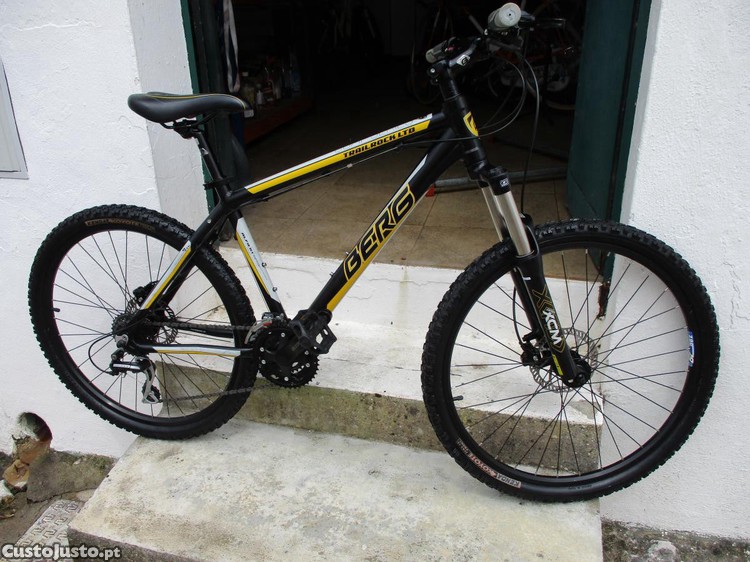 Bicicleta BTT BERG Trail Rock LTD Comp Series, cor preta e dourada, roda 26, c/ 24, travões de disco TEKTRO hidráulicos, pneus KENDA Coyote, suspensão SUNTOUR XCM, mudanças SHIMANO Acera c/ 24 speeds, totalmente revista, lubrificada e afinada por quem sabe.