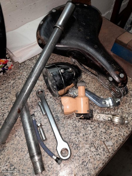 Farol original 30EUR,dínamo com farol 25EUR selim de pele Tabor 40EUR, bomba de ar com racord 20EUR, crenco e cavilhas 10EUR.Preços individuais e por peças.
