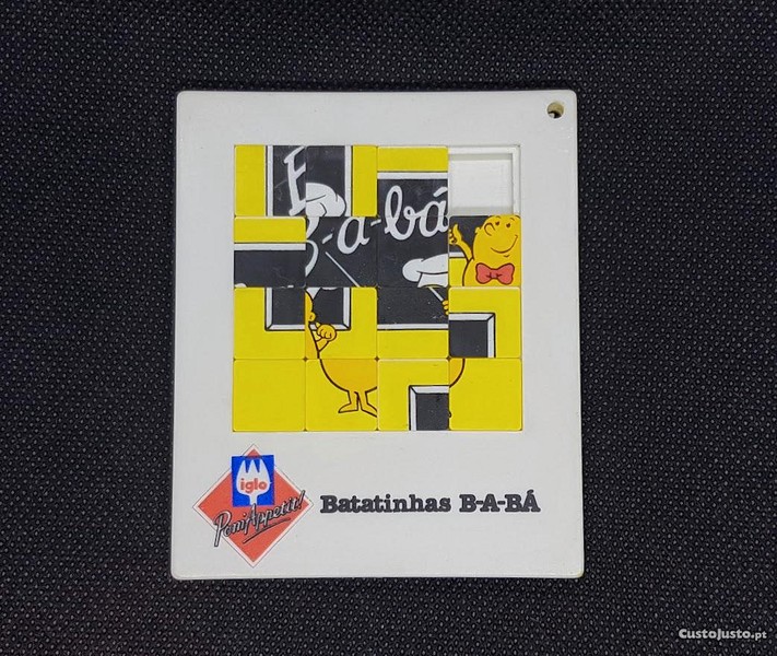 Este jogo, da década de 1980, saía como brinde surpresa nas embalagens da marca Iglo. Encontra-se totalmente funcional e mantém as cores e aspeto original. Mede 9,3cm alt. x 7,7cm larg x 6mm espessura. Pesa 30g.