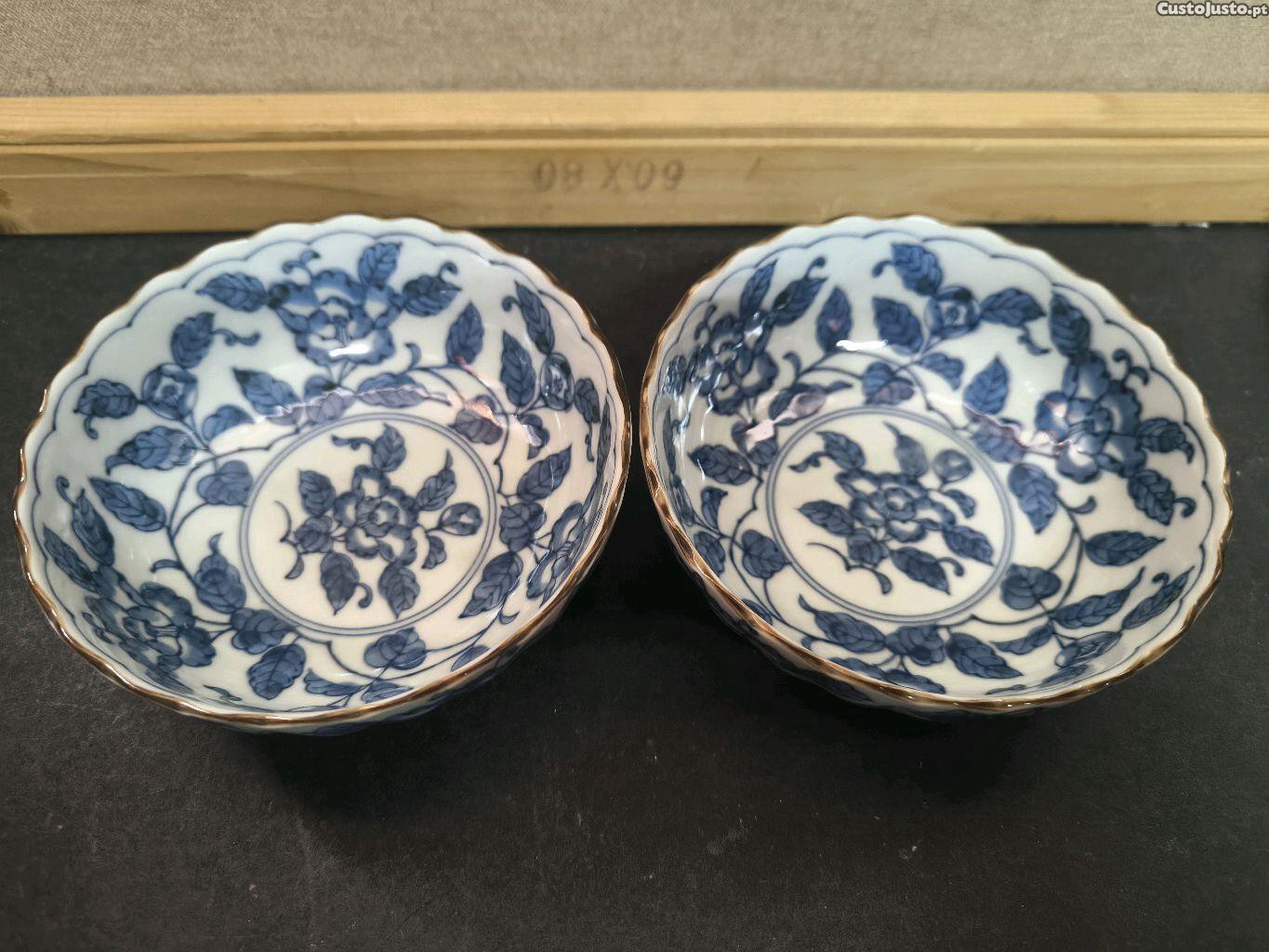 2 Taças Porcelana Azul e Branca Borda Dourada