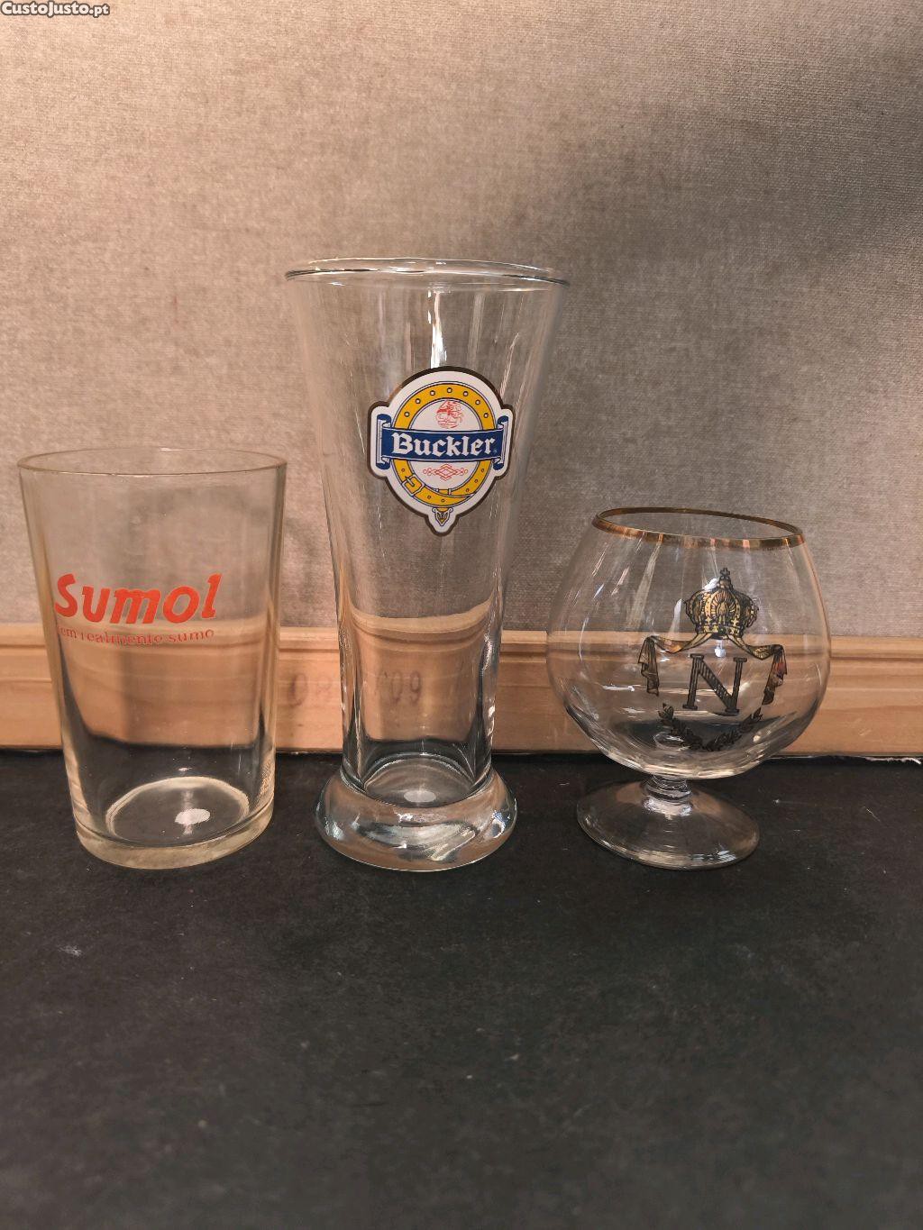 3 Copos Cerveja - Sumol, Buckler. Três copos de marcas diferentes. Um copo da marca Sumol, um copo da marca Buckler e um copo de licor. Todos em bom estado.