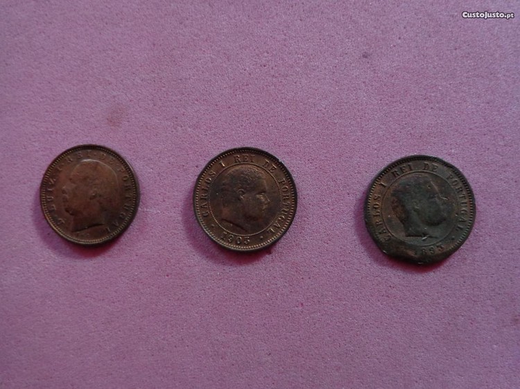 3 moedas de V (5 )reis 1 1882 D. Luiz I,1 de 1893-D. Carlos I e 1 de 1905 D. Carlos