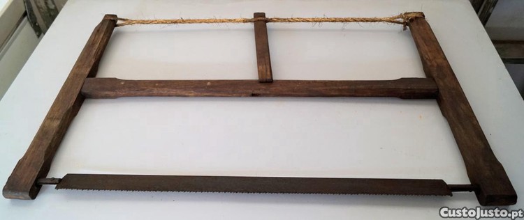 Preço fixo, não negociável. Em caso de envio acrescem portes. Antiga ferramenta de trabalho com mais de 50 anos de existência, com sinais disso mesmo pelo desgaste, marcas de uso e lâmina oxidada. Numa das extremidades possui a lâmina de corte e na outra o esticador em cordel que tem por função a tensão da lâmina. Peça de artesanato manufaturada, ótimo artigo de embelezamento/exposição. Em excelente estado geral. Apresenta vestígios de bicho da madeira mas já tem tratamento aplicado. Dimensões: 70,5cm comp. X 43cm alt. Obs.: A tonalidade da cor apresentada nas fotos poderá não corresponder exatamente à real, por motivos de incidência de luz e/ou ângulo das fotos captadas. Veja também os meus outros anúncios, ateste a minha antiguidade enquanto utilizador registado. Honestidade, seriedade e rapidez nas respostas e entregas/envios.