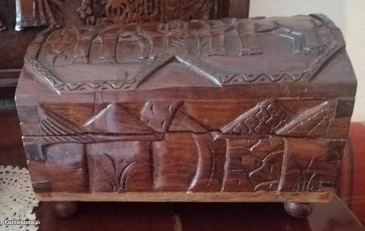 Antigo baú porta jóias, feito de madeira pau santo maciça com entalhes em relevo.