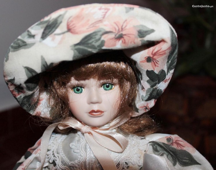 Boneca de porcelana, vestida à dama antiga