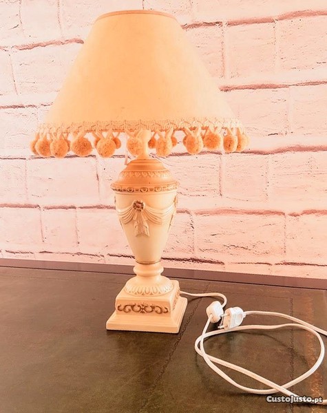 Candeeiro em excelente estado geral, proveniente da década de 1990, em faiança com abajur em pele sintética com remates, galão e berloques em tecido.