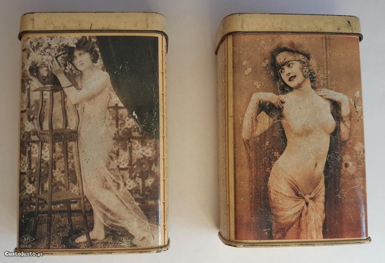 Par de cigarreiras em lata dos anos 60, em perfeito estado ainda que com marca do tempo.