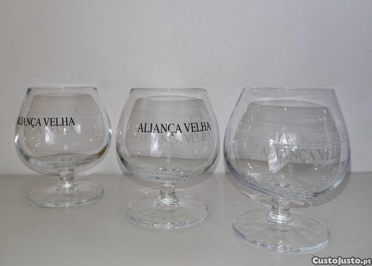 Copos de aguardente de fabrico português Aliança Velha com a respetiva inscrição. Todos os copos se encontram em excelente estado, sem quaisquer danos.