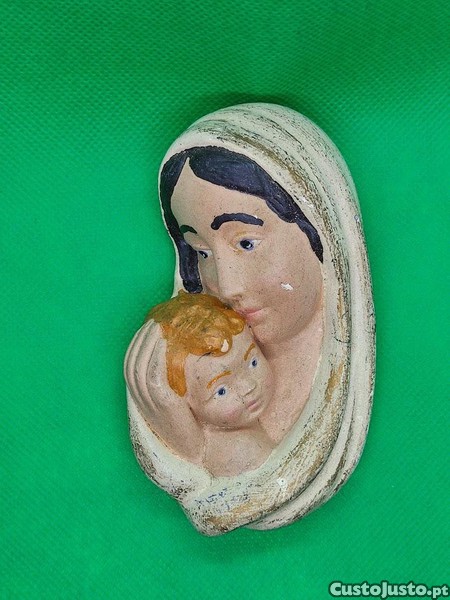 Figura de artesanato de Nossa Senhora com o menino Jesus ao colo, em gesso, para pendurar. Peça antiga, com sinais evidentes do tempo e manuseio.