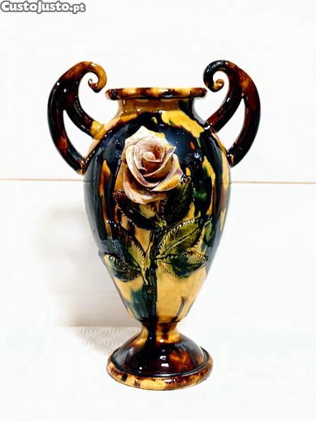 Jarra em faiança das Caldas da Rainha com vidrado escorrido. A peça apresenta uma decoração em relevo com motivos florais, nomeadamente uma rosa (possui uma pequena lasca numa das pétalas conforme visível nas fotos anunciadas) proeminente numa das faces e as suas cores predominantes são o castanho, o bege, o verde e o preto. As pegas têm um formato curvo e elegante e a base é larga e estável.