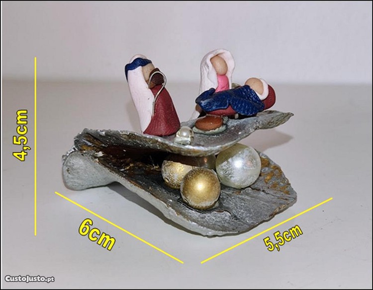 Pequenino presépio artesanal e minucioso, em peça única alvo de colagens, figurando uma ostra com pérolas no interior, composto por materiais diversos da natureza e reaproveitados, retratando José, Maria e Jesus no berço.