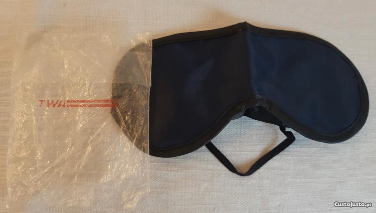 Protetor de olhos para dormir, utilizado a bordos dos voos intercontinentais da TWA (anos 80 do século passado. Novos, na embalagem original, nunca utilizados.