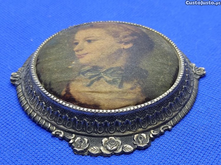 Quadro antigo, formato circular com trabalho de ilustração em seda de forma abaulada em relevo, retratando dama medieval em moldura de base metálica.