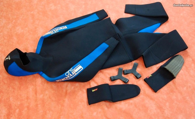 Fato de mergulho de 5,5mm, composto por 2 peças (calças e casaco), marca Simotal, tamanho L (54), em excelente estado e devidamente bem tratado, pouco uso e sem rasgões.