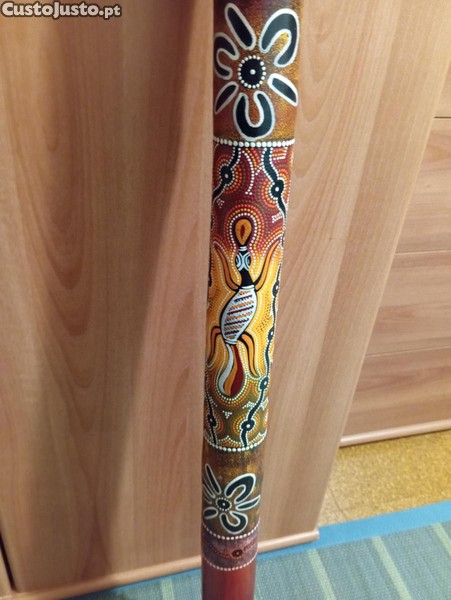 Instrumento musical Didgeridoo ornamentado, praticamente novo, há alguns anos guardado, com saco de transporte original; O didgeridoo é um instrumento de sopro dos aborígenes australianos. Seu som é produzido pela vibração dos lábios e por outros sons produzidos pelo instrumento;