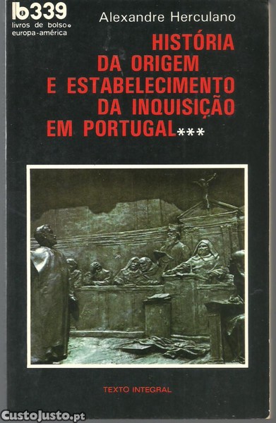 HISTÓRIA DA ORIGEM E ESTABELECIMENTO DA INQUISIÇÃO EM PORTUGAL - III. *** Alexandre Herculano *** [Mem Martins]: Publicações Europa-América, [Sem ind. de ano: 1982]. Colecção "Livros de Bolso Europa-América" - 339. (18 x 11,5 cm.) com 162 + [2] pp. Capa flexível. Exemplar razoável. Capa com marcas de manuseamento, pequenas manchas de acidez (só visíveis na parte de dentro) e um pouco gasta nas margens e nas extremidades da lombada, mas, de um modo geral, ainda em boas condições e limpa. Páginas globalmente bem conservadas e limpas, embora se encontrem um pouco amarelecidas (mais fortemente nas margens) e com algumas manchas de acidez (pouco frequentes e de reduzida importância), devendo-se tudo, fundamentalmente, à qualidade do papel utilizado. *** Primeira edição na colecção do terceiro volume , e último, (que comporta os Livros VII a X da edição original) desta obra de referência sobre a Inquisição Portuguesa, ainda hoje imprescindível para o seu estudo. *** Portes: envio gratuito em correio normal (tarifa especial para livros) * envio em correio registado: 1,70