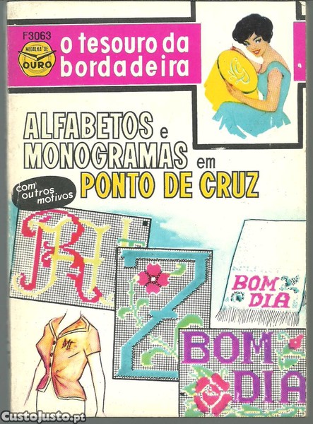 ALFABETOS E MONOGRAMAS EM PONTO DE CRUZ. *** R. Cataldi *** Rio de Janeiro: Edições de Ouro, 1962. [Publicado, composto e impresso por Tecnoprint Gráfica S. A. - Rio de Janeiro]. Série "O Tesouro da Bordadeira". (16 x 11,5 cm.) com [-2] + 137 + [5] pp. (devido a um erro de numeração das páginas, pois não falta nenhuma folha, a primeira página numerada tem o n. 11, quando deveria ter o n. 9). Com muitas ilustrações a p/b.. Capa flexível. Exemplar razoável. Capa com marcas de manuseamento, algumas manchas, pequenas perdas de cor em alguns pontos, vincos discretos e um pouco gasta nas margens e na lombada. Globalmente, apesar de envelhecida, está ainda muito apresentável. Páginas, de um modo geral, em bom estado, embora apresentem um ligeiro amarelecimento e pequenas manchas de acidez que atingem sobretudo os cortes e as margens de algumas folhas. *** Presumível primeira edição deste livro que apresenta, na 1. parte, «Alfabetos maiúsculos e minúsculos, nomes próprios e números para marcar aventais e enxovais para o colégio, para formar iniciais para blusas, blusões, vestidos e para marcar panos de cozinha, toalhas de mão, etc. Barrinhas, gregas e pequenos motivos para enfeitar letras. Na 2. parte apresenta «Alfabetos e monogramas em tamanho grande, simples e enfeitados, próprios para marcar roupas de cama e mesa, toalhas de banho, encostos de capas para poltronas e cadeiras, colchas, cobertores, etc., assim como compor dizeres para bandeiras, flâmulas, fitas comemorativas, escudos de clubes, etc., tudo para bordar em ponto de cruz. *** Portes: envio gratuito em correio normal (tarifa especial para livros) * envio em correio registado: 1,70