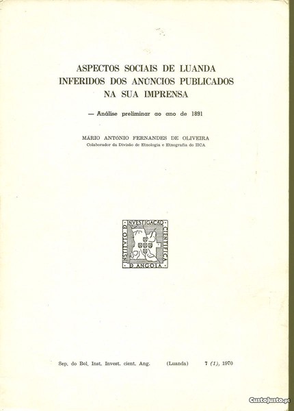 ASPECTOS SOCIAIS DE LUANDA INFERIDOS DOS ANÚNCIOS PUBLICADOS NA SUA IMPRENSA Análise preliminar ao ano de 1891. *** Mário António Fernandes de Oliveira [Colaborador da Divisão de Etnologia e Etnografia do IICA] *** [Luanda]: [Instituto de Investigação Científica de Angola], [1970]. (Tipografia Angolana - Luanda). (30 x 21 cm.) com 12 pp. Capa flexível. Exemplar razoável. Capa com marcas de manuseamento, algumas manchas, pequenos vincos e levemente empoeirada, mas, de um modo geral, ainda em boas condições. Páginas bem conservadas e limpas. Tem, no entanto, um pequeno carimbo de oferta do editor na primeira página e tem junto um cartão/postal impresso, também do editor, a solicitar a permuta de publicaçõe. *** Provável primeira e única edição independente deste interessante trabalho, publicado em separata do Boletim do Instituto de Investigação Científica de Angola 7 (1), 1970. Lê-se no resumo que o Autor estuda os anúncios da imprensa de Luanda, na sequência de análises feitas aos anos 1851, 1861, 1871 e 1881, através de O Mercantil, principal veículo de publicidade impressa em Luanda, em 1891. A colecção utilizada não se encontra completa, mas nem por isso perde a sua representatividade, uma vez que esse facto não afecta a distribuição dos anúncios por categorias, ressalvadas talvez uma ou outra de maiores oscilações estacionais. Foram as seguintes as categorias de anúncios que se destacaram: 1., Bens de consumo, perfazendo 34% da amostra; 2., Pessoais, 14%; 3., Serviços, 14%; 4., Vida comercial, 13%; e 5., Transportes, 8%. Em relação às análises anteriores, na categoria de «Serviços, nota-se aumentada diferenciação na procura. Na categoria de «Transportes, que já anteriormente surgira, uma nota importante é a que respeita aos transportes colectivos urbanos regulares, movidos por animais. O Autor espera integrar numa perspectiva de mudança social as análises feitas cobrindo a segunda metade do século XIX e de que as primeiras quatro foram publicadas no Boletim do Instituto de Angola, 17-18-19-27, 1963 4, 7. Muito curioso e invulgar. *** Portes: envio gratuito em correio normal (tarifa especial para livros) * envio em correio registado: 1,70