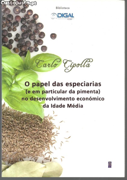 O PAPEL DAS ESPECIARIAS (E EM PARTICULAR DA PIMENTA) NO DESENVOLVIMENTO ECONÓMICO DA IDADE MÉDIA. *** Carlo Cipolla *** Título original: Il ruolo delle spezie (e del peppe in particolare) nello sviluppo economico del Medioevo (Este texto faz parte do livro «Allegro ma non Troppo, que é composto por este ensaio e por um outro, «As leis fundamentais da estupidez humana) *** Tradução: Padrões Culturais Editora, tendo por base a edição portuguesa da Celta Editora, publicada em 1993 *** Lisboa: Padrões Culturais Editora, 2014. [Biblioteca DIGAL]. (19,5 x 13,5 cm.) com 47 + [9] pp. Capa flexível. Bom exemplar. Capa com ligeiras marcas de manuseamento, encontrando-se bem conservada e limpa. Páginas em bom estado e limpas. *** Presumível primeira edição portuguesa independente deste ensaio, originalmente incluído no livro «Allegro ma non Troppo, no qual o Autor, num registo bem humorado, rastreia as curiosas correlações existentes entre as importações de especiarias e a expansão demográfica nos finais da Idade Média, estabelecendo uma causalidade devida a um suposto efeito afrodisíaco da pimenta preta. *** Portes: envio gratuito em correio normal (tarifa especial para livros) * envio em correio registado: 1,70