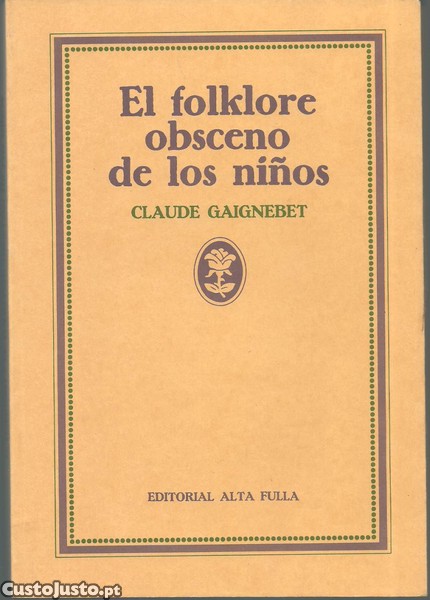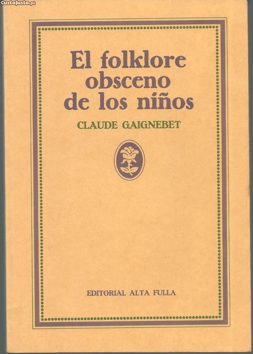 EL FOLKLORE OBSCENO DE LOS NIÑOS. *** Claude Gaignebet *** Título de la edición original: Le folklore obscène des enfants *** Traducción: A. Arranz Griñán, J. A. Martínez Schrem y M. Rodríguez Riverola *** Diseño: Teresa Camps y Josep Molí *** Barcelona: Editorial Alta Fulla, 1986. Colecção: Arte del Zahorí 3. (24 x 16,5 cm.) com 246 + [10] pp. Com algumas ilustrações a p/b.. Capa flexível, com badanas. Bom exemplar. Capa com pequenas marcas de manuseamento e algumas manchas ligeiras, encontrando-se bem conservada e limpa. Páginas em bom estado e limpas. *** Primeira edição espanhola desta muito curiosa obra francesa (julgo que ainda não publicada em Portugal ou até em língua portuguesa), na qual o Autor estuda uma certa forma própria de transmissão de conhecimentos (ou de superação imaginária do que se desconhece), utilizada pelas crianças no que se refere sobretudo a assuntos relacionados com a sexualidade. Sobre o livro, pode ler-se na contracapa (e numa tradução bastante livre): «Na sua própria sociedade, muitas crianças utilizam determinados textos, palavras ou gestos que podem ser classificados como "obscenos". Aparentemente, as crianças nunca tiveram de esperar que os educadores lhes explicassem a realidade das coisas. Geração após geração, século após século, na microssociedade infantil, o conhecimento sexual é transmitido sob a forma de histórias, charadas, jogos ou canções. Este conhecimento é mal visto pelos adultos e transmitido de forma distorcida, carregado de imagens, símbolos, mitos e fantasias. Dentro da sua própria faixa etária ou entre adultos, as crianças vão adquirindo gradualmente este folclore sexual e escatológico, que faz parte da formação da sua personalidade.» (Índice nas imagens 6, 7 e 8). Texto em espanhol. Pouco vulgar. *** Portes: envio gratuito em correio normal (tarifa especial para livros) * envio em correio registado: 1,70