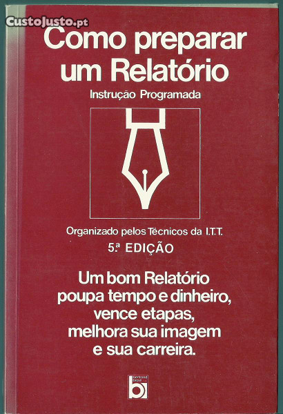 COMO PREPARAR UM RELATÓRIO. Instrução Programada. *** Manual Preparado pelos Técnicos do ITT Service, Federal Electric Corporation, E. U. A. *** Tradução e adaptação de Orlando Agueda *** Título do original: How to White [sic] Effective Reports *** Rio de Janeiro: Editora Bertrand Brasil S.A., 1989. (21 x 14 cm.) com [10] + 310 pp. Capa flexível, com badanas. Exemplar razoável. Capa com algumas marcas de manuseamento, pequenos vincos e um ligeiro desgaste nas margens e na lombada, encontrando-se, globalmente, ainda em bom estado e limpa. Páginas bem conservadas e limpas. Tem uma pequena etiqueta de livraria colada na primeira página. *** 5. edição deste livro que pretende constituir-se como um curso de instrução programada sobre a técnica de escrever um relatório de qualidade superior, mostrando como seleccionar o tipo de relatório que melhor apresentará a informação e quais as informações que devem ser incluídas, a fim de satisfazer as exigências de determinada missão, e como escrevê-lo em estilo que seja facilmente legível, interessante e corecto. (Índice na imagem 5). *** Portes: envio gratuito em correio normal (tarifa especial para livros) * envio em correio registado: 1,70