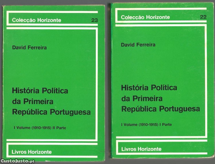 HISTÓRIA POLÍTICA DA PRIMEIRA REPÚBLICA PORTUGUESA. I Volume (1910-1915). Parte I [e] Parte II. *** David Ferreira *** Lisboa: Livros Horizonte, 1973. Colecção Horizonte - 22/23. 2 vols. (18 x 12 cm.) com 216 + [2] pp. e 238 + [2] pp. Capas flexíveis. Exemplares razoáveis. Capas com marcas de manuseamento , algumas manchas de acidez (de reduzida importância), pequenas perdas de cor em alguns pontos e um pouco gastas nas margens e nas lombadas, que apresentam ambas pequenas esfoladelas junto da base. A lombada do volume que corresponde à primeira parte apresenta também vincos de abertura. Apesar de tudo, de um modo geral, estão ainda em boas condições. Páginas bem conservadas e limpas, embora apresentem um tom amarelecido (mais evidente nas margens), próprio do papel. A última página do I Volume Parte I apresenta algumas manchas (dedadas), mas que são na verdade imperfeições (ou negligências) de tipografia. Ambos os volumes têm uma pequena etiqueta da editora colada na primeira página. *** Primeira edição deste importante trabalho, a propósito do qual escreve o Autor: «Supondo que mais de meio século constitui suficiente perspectiva histórica, abalancei-me a escrever o presente livro, embora sem me esquecer de que vivo num país onde alguns familiares de figuras da política nacional, com a pretensão de terem sido os seus parentes dotados de talentos execepcionais - que, na maioria dos casos, não possuíram -, se insurgem contra os escritores que não classificam aqueles antepassados entre os grandes vultos da política portuguesa. Na impossibilidade de tentar escrever a História da I República Portuguesa, limitei-me a traçar somente a sua história política, ou das lutas políticas que nela se desenvolveram durante a sua curta vigência. (Índice da Parte I nas imagens 6 e 7 e Índice da Parte II na imagem 8). *** Portes: envio gratuito em correio normal (tarifa especial para livros) * envio em correio registado: 1,70