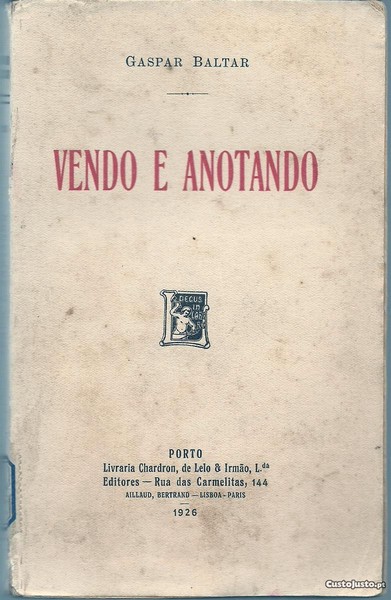 VENDO E ANOTANDO. *** Gaspar Baltar *** Porto: Livraria Chardron, de Lelo & Irmão, L.da editores; Lisboa Paris: Aillaud, Bertrand, 1926. (19,5 x 12 cm.) com 208 + [4] pp. Capa flexível. Exemplar razoável. Capa com marcas de manuseamento, manchas e um pouco gasta nas margens e na lombada, onde faltam mesmo alguns pedacinhos de papel. Tem uma etiqueta colada na lombada com um número manuscrito. Apesar de envelhecida e não muito limpa, globalmente encontra-se ainda bastante apresentável. Páginas, de um modo geral, bem conservadas e limpas, embora apresentem um tom amarelecido e algumas pequenas manchas de acidez (pouco frequentes), sendo tudo próprio do papel. *** Primeira edição deste livro de crónicas de viagens realizadas pelo Autor em vários países europeus, que contribuem sobretudo para o conhecimento do ambiente político, em grande transformação, que nessa época se vivia na Europa. (Índice na imagem 5). *** Portes: envio gratuito em correio normal (tarifa especial para livros) * envio em correio registado: 1,70