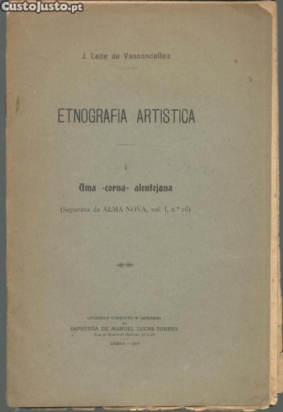 ETNOGRAFIA ARTÍSTICA. I - Uma «corna alentejana. *** J. Leite de Vasconcellos *** Lisboa: [Sem ind. de editor], 1916. (Composto e impresso na Imprensa de Manuel Lucas Torres - Lisboa). (24,5 x 16 cm.) com 12 + [4] pp. + uma folha onde está colada uma estampa com um desenho de Saavedra Machado. Capa flexível. Exemplar razoável. Capa envelhecida, com fortes marcas de manuseamento, vincos, pequenas manchas e bastante gasta nas margens e na lombada (que foi mesmo restaurada na parte de dentro), faltando também alguns pedacinhos de papel (os mais importantes nos cantos superiores externos). Os agrafos que unem as páginas estão bastante oxidados. Apesar de tudo, de um modo geral, está ainda apresentável. Páginas globalmente bem conservadas e limpas, embora apresentem um tom amarelecido e algumas pequenas manchas. As margens encontram-se um pouco gastas e amachucadas, pois excedem os limites da capa. *** Primeira edição independente, publicada em Separata da revista Alma Nova, vol. I, n. 16, deste breve estudo artístico e etnográfico, da autoria de um dos mais eminentes etnógrafos portugueses, de uma "corna" alentejana, feita por um pastor e pertença do Museu Etnográfico. "Córna", lê-se no trabalho, «tem neste caso a significação de recipiente feito de um segmento de chifre de boi, de 0m,15 a 0m,20, plus minus, de altura, com fundo e tampa de cortiça, e a superficie muitas vezes cheia de lavores artisticos, como aqui: serve principalmente para conter azeitonas, mas póde conter carne de porco, e outros mantimentos, e servir de vaso de beber. Utilizam-na os pastores e trabalhadores do Alentejo quando vão para o campo. De presumível pequena tiragem. *** Portes: envio gratuito em correio normal (tarifa especial para livros) * envio em correio registado: 1,70
