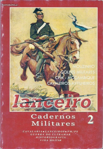 LANCEIRO. Cadernos Militares 2. *** Director e Editor: José Manuel dos Santos Costa *** Colaboradores: Ângelo Freire, Augusto Fialho, Carlos Carreira, Daniel Albergaria, Fernando Emygdio Silva, João Cardoso Pereira e Luís Ferreira *** Colaboram neste número: António Campos, Tcor Cav António Marcos de Andrade, Gen António Martins Barrento, Cor Cav António Monteiro da Graça, Cor Cav António Nunes Melo, Carlos Dias de Almeida, Sarg Mor Cav Fernando Lourenço, Francisco dAguiar, João Henriques Simões, João Sena, João Teixeira Pedro, Cor Art João Vieira Borges, Luís Alfacinha de Brito, Ten RC Maria Rosa, Pedro Teixeira Pinto, RL2 e Roberto de Moraes *** Lisboa: Associação dos Antigos Oficiais de Lanceiros, 2009. (21 x 14,5 cm.) com 98 + [2] pp. Profusamente ilustrado a cores e a p/b.. Capa flexível. Exemplar razoável. Capa com evidentes marcas de manuseamento, manchas ligeiras, pequenas perdas de cor em alguns pontos e um pouco gasta nas margens e na lombada. Apesar de acusar algum uso, de um modo geral, encontra-se ainda muito apresentável. Páginas bem conservadas e limpas. *** Segundo número dos Cadernos Militares do Lanceiro, publicação semestral que, de algum modo, sucede ao jornal Lanceiros, de que se publicaram 30 números, entre 1999 e 2007. Inclui vários artigos sobre Cavalaria, Lanceiros, PM/PE, Guerra do Ultramar, Historiografia e Vida Militar. (Índice completo na imagem 4). Impresso em bom papel. *** Portes: envio gratuito em correio normal (tarifa especial para livros) * envio em correio registado: 1,70