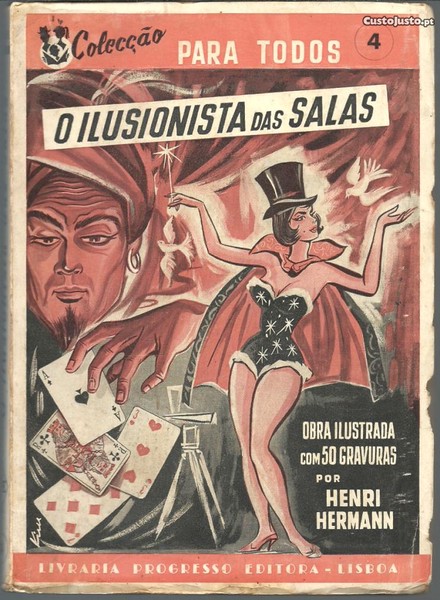 O ILUSIONISTA DAS SALAS. Ligeireza e Escamoteação. Sortes de cartas e outras, sem o emprego de aparelhos. Subtilezas engenhosas e recreativas. Obra ilustrada com 50 gravuras. *** Henri Hermann *** Lisboa: Edição da Livraria Progresso Editora, [Sem ind. de ano: talvez do começo da década de 1960]. Colecção para Todos - 4. (20 x 14 cm.) com 119 + [9] pp. Com algumas ilustrações a p/b.. Capa flexível. Exemplar razoável. Capa com marcas de manuseamento, algumas manchas, pequenos vincos e um pouco gasta nas margens e na lombada, que apresentam mesmo alguns pequenos rasgões e a falta de pequenos pedaços de papel (sobretudo na margem lateral externa da capa da frente). Globalmente, apesar de algo envelhecida, está ainda bastante apresentável. Páginas em relativo bom estado, embora apresentem um tom amarelecido e algumas manchas de acidez (que se concentram mais nas primeiras e nas últimas). *** 2. edição, aumentada e melhorada deste livro de ilusionismo, comportando sobretudo truques com cartas, mas não só. Dada a ausência de índice, indicam-se as quatro partes em que se divide a obra: Princípios Fundamentais para Todas as Sortes de Cartas; Recreios Aritméticos; Mágicas; Jogos de Física. Livro curioso e pouco vulgar. *** Portes: envio gratuito em correio normal (tarifa especial para livros) * envio em correio registado: 1,70