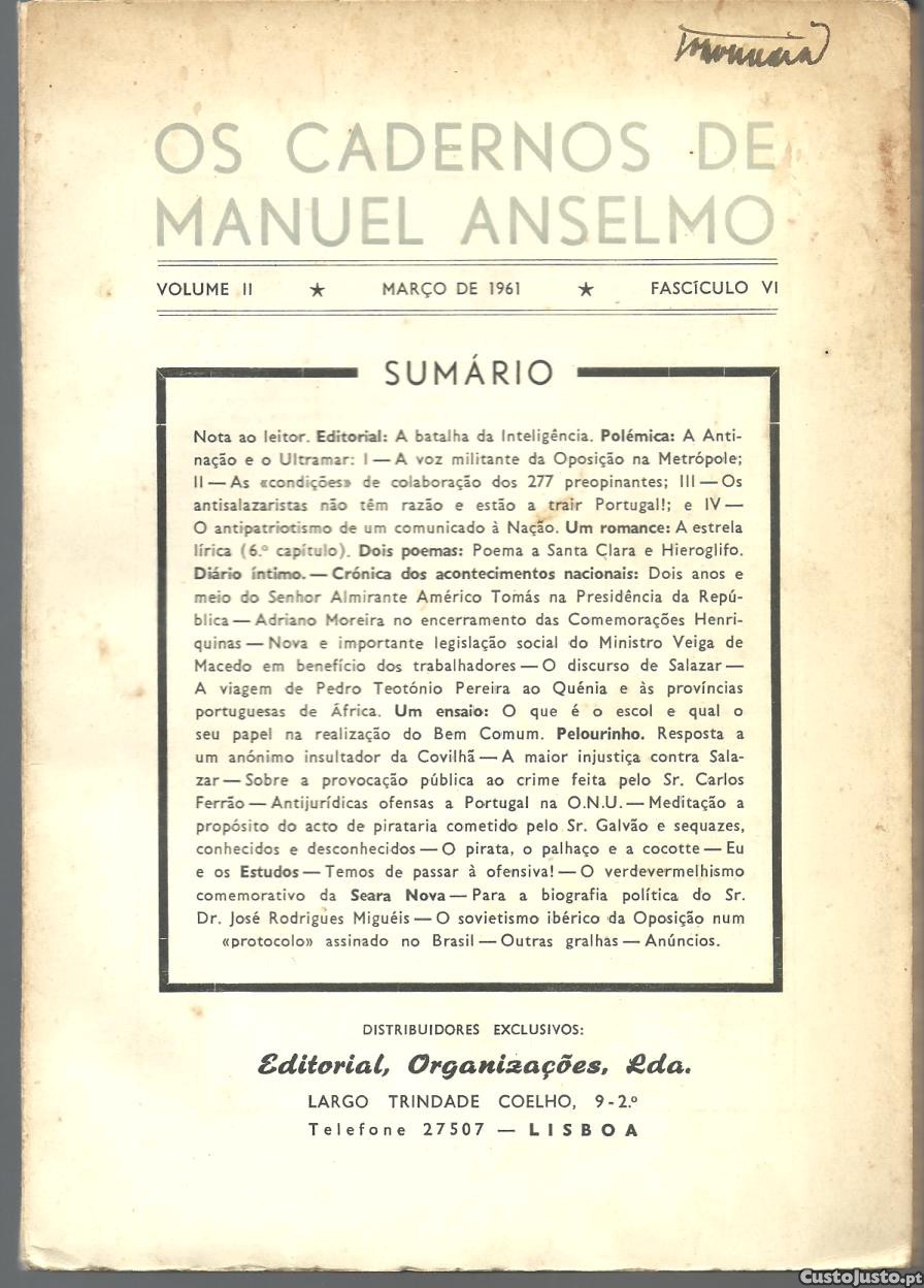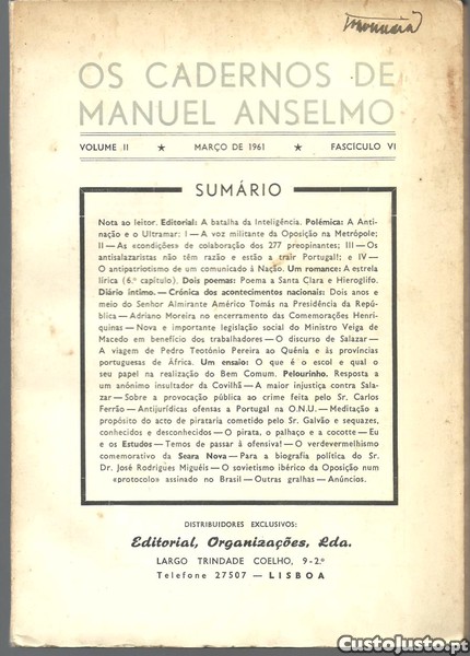 Preço: 5 €Os Cadernos de Manuel Anselmo - Volume II - Março de 1961 - Fascículo VI