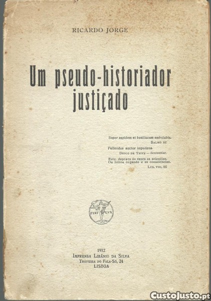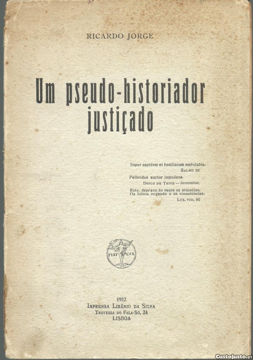 UM PSEUDO-HISTORIADOR JUSTIÇADO. *** Ricardo Jorge *** Lisboa: Imprensa Libânio da Silva, 1932. (23 x 16 cm.) com [-2] + 31 + [2] pp. Capa flexível. Exemplar razoável. Capa envelhecida, com evidentes marcas de manuseamento, manchas de acidez, um pouco empoeirada e gasta nas margens e na lombada, que apresenta também rasgões nas extremidades, que foram fixados com cola. Páginas em relativo bom estado, embora apresentem um tom amarelecido (mais forte nas margens), algumas pequenas manchas de acidez (raras) e os cantos exteriores um pouco gastos, tudo devido fundamentalmente à fraca qualidade do papel utilizado. Falta a primeira folha (anterrosto). *** Primeira edição deste opúsculo escrito em tom corrosivo por Ricardo Jorge em crítica a Silva Carvalho, por omitir qualquer referência aos seus contributos de investigador e historiador médico na «História da Medicina Portuguesa (1929) e no artigo "Literatura Médica no Século XVI" [incluído na «História da Literatura Portuguesa (1931), de Forjaz de Sampaio] - além de outros trabalhos menores -, embora deles se tivesse servido na elaboração dos referidos trabalhos. Mas a crítica de Ricardo Jorge vai ainda mais longe, denunciando as falhas, as omissões e até as insuficiências de conhecimento que Silva Carvalho revela nos seus trabalhos. Curioso e pouco vulgar. *** Portes: envio gratuito em correio normal (tarifa especial para livros) * envio em correio registado: 1,70