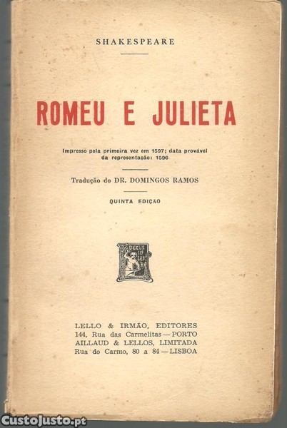 ROMEU E JULIETA. Impresso pela primeira vez em 1597; data provável da representação: 1596. *** Shakespeare *** Tradução do Dr. Domingos Ramos *** Porto: Lello & Irmão, Editores; Lisboa: Aillaud & Lellos, Limitada, [Sem ind. de ano: talvez da década de 1940]. (19 x 12 cm.) com XXVI + 209 + [1] pp. + uma folha com um retrato do Autor a p/b.. Capa flexível. Exemplar razoável. Capa com marcas de manuseamento, pequenas manchas, alguns vincos e um pouco gasta nas margens e na lombada, que se encontra também um pouco escurecida e apresenta vincos de abertura. Apesar de envelhecida, de um modo geral, está ainda muito apresentável. Páginas globalmente bem conservadas e limpas, embora apresentem um tom amarelecido (mais forte nas margens) e algumas pequenas manchas de acidez (pouco importantes e pouco frequentes, incidindo quase só nas primeiras e nas últimas). *** 5.ª edição (da tradução e talvez na editora) deste clássico da dramaturgia universal e a mais conhecida obra de William Shakespeare. A peça surge antecedida por um longo texto que analisa e detalha o seu conteúdo. *** Portes: envio gratuito em correio normal (tarifa especial para livros) * envio em correio registado: 1,70