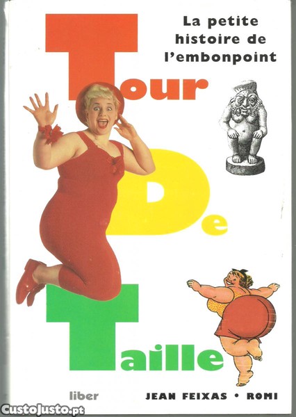 TOUR DE TAILLE. La Petite Histoire de l'Embonpoint. *** Jean Feixas - Romi *** [Genève (Suíça)]: Liber, 1996. (25,5 x 17 cm.) com 190 + [2] pp. Profusamente ilustrado a p/b. e a cores. Capa dura, com sobrecapa de papel ilustrada. Bom exemplar. Sobrecapa com marcas de manuseamento, manchas ligeiras, discretos vincos de pressão e um pequeno desgaste nas margens, mas encontrando-se ainda, globalmente, em bom estado e limpa. Capa dura com marcas de uso, um pequeno desgaste nas margens, que se encontram também ligeiramente amachucadas em alguns pontos e tendo um pequeno rasgão na charneira superior, de pequena importância e que parece, na verdade, uma imperfeição tipográfica. Globalmente, encontra-se ainda em bom estado e limpa. Páginas bem conservadas e limpas. *** Primeira edição deste curioso livro que contém uma insólita história do excesso de peso ou das pessoas gordas, célebres e anónimas, mostrando, por entre inúmeras anedotas divertidas e, por vezes, picantes, como a beleza não se mede em centímetros e é muitas vezes apenas uma questão de perspectiva ou de convenções sociais mais ou menos transitórias. (Índice na imagem 7). Impresso em bom papel. Texto em francês. *** Portes: envio gratuito em correio normal (tarifa especial para livros) * envio em correio registado: 1,70