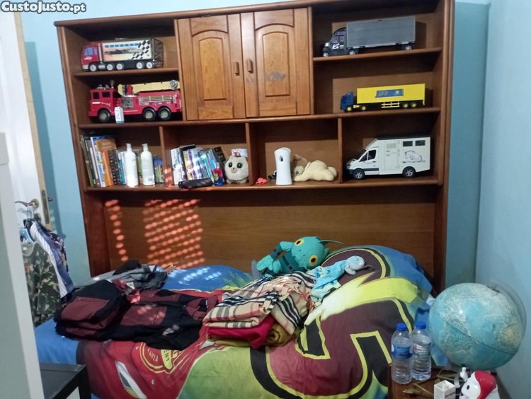 Estúdio com duas camas e um colchão que o gavetão de baixo fica ao nível da cama de cima e faz cama de casal , com secretária com prateleiras e um móvel para colocar livros em bom estado de conservação.