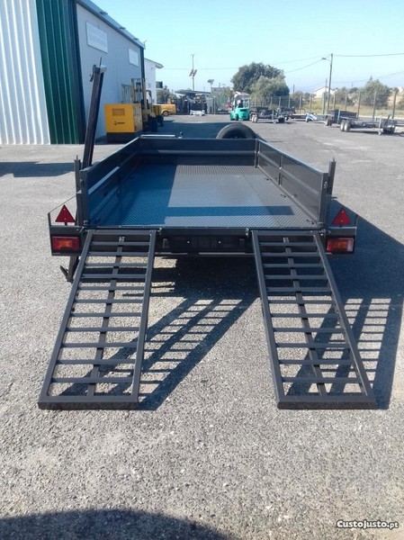 equipado com rampas de carga que podem ser fixas atrás e também colocadas por baixo na traseira do reboque fixas , dois eixos , de 1750 kg cada , travão de inercia em aço vazado de 3500 kg chave de segurança , roda jockey automática de 60 mm apoios traseiros reguláveis